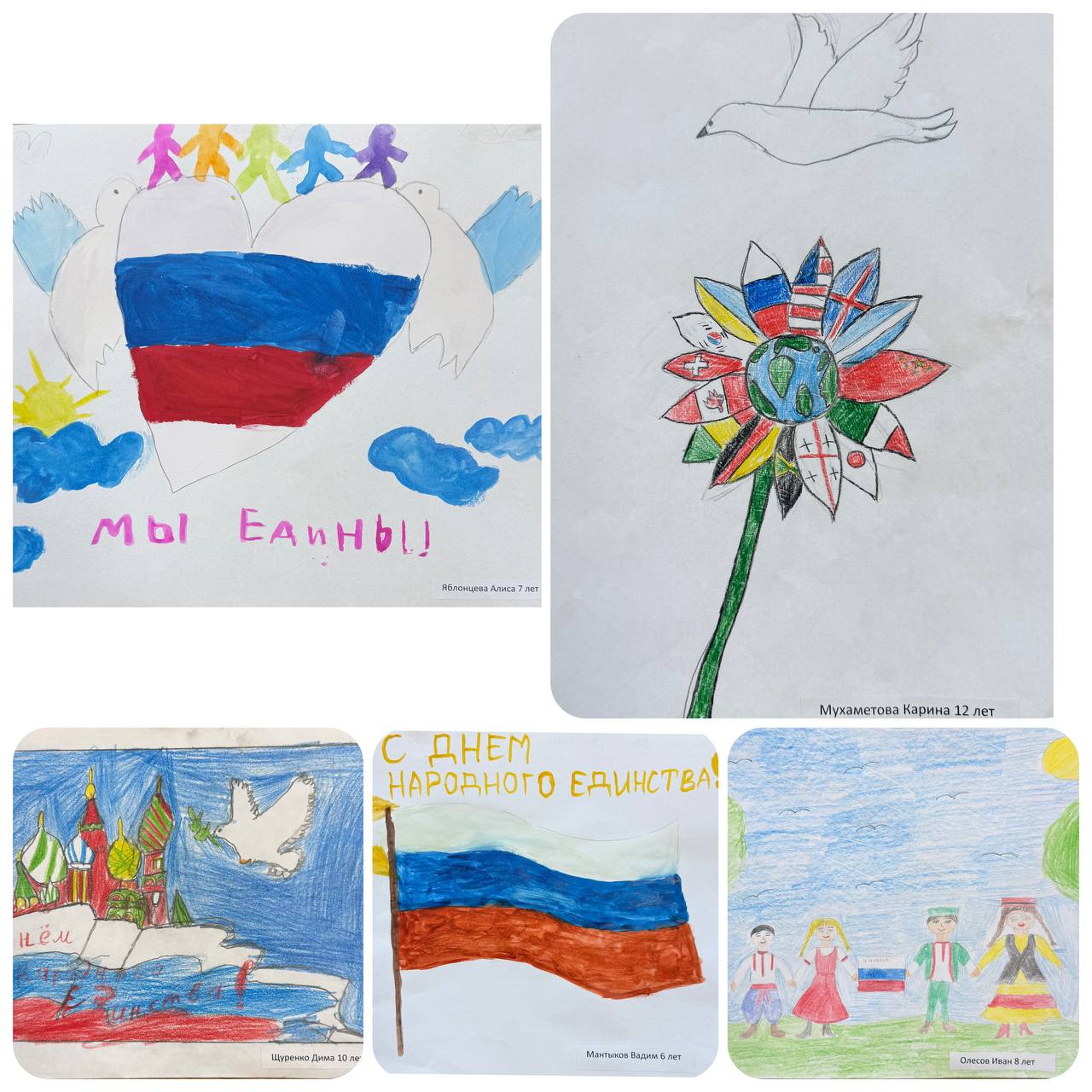 На рисунках ожили яркие образы нашей многонациональной страны. Дети изобразили людей в народных костюмах, взявшихся за руки, флаги России, символы мира – голубей и радугу, а также исторические сюжеты, связанные с подвигом народного ополчения 1612 года.