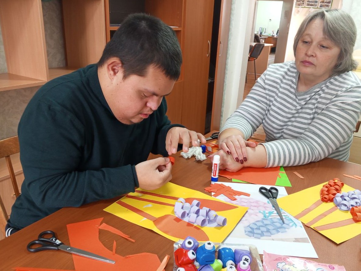 Пока мамы создавали обереги, дети под руководством специалистов на занятии в рамках социальной занятости трудились над праздничными открытками. Ребята освоили технику изготовления объёмных цветов из цветной бумаги.